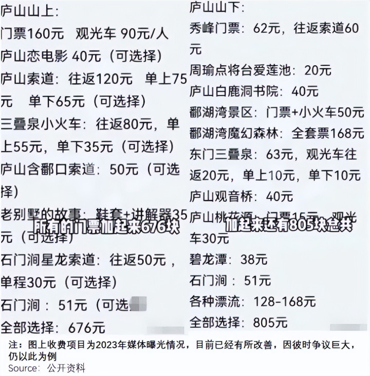 这还不算最离谱的,之前庐山“套娃收费”的事闹得挺大,有同行算过一笔账,想把庐山所有景点逛完,得花近1500块。